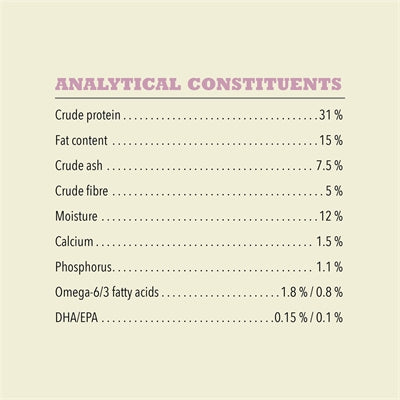 Ruw eiwit 31 %, Ruw vet 15 %, Ruwe as 7,5 %, Ruwe celstof 5 %, Vocht 12 %, Calcium 1,5 %, Fosfor 1,1 %, Omega-6 vetzuren 1,8 %, Omega-3 vetzuren 0,8 %, DHA / EPA 0,15 % / 0,1 %, Glucosamine 600 mg/kg, Chondroitine 800 mg/kg.