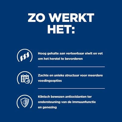 Honden en katten kunnen aanzienlijke stofwisselingsveranderingen ervaren tijdens herstel na een operatie, ziekte of letsel. Onder deze stressvolle omstandigheden wordt het immuunsysteem van je huisdier zwaar op de proef gesteld, waardoor de juiste voeding essentieel is. Hill’s Urgent Care biedt hoge niveaus van verteerbare eiwitten en vetten, klinisch bewezen antioxidanten, een energierijke formule en uitzonderlijke smaak om eten aan te moedigen.