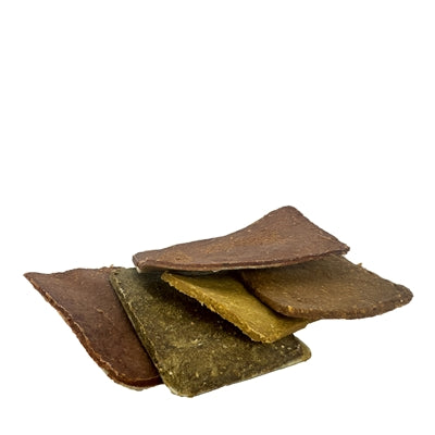 Samenstelling: Buffelhuid 49,5%, rund óf kip óf eend óf vis óf kaas 25% Kleefrijstmeel, 12,8% gelatine, gemodificeerd tapioca zetmeel, plantaardige vetten, kurkuma 1,4%