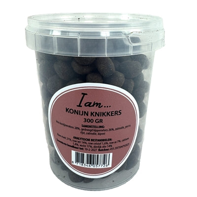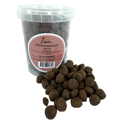 I AM Konijn Knikkers 300 grDe I AM Konijn Knikkers is een smakelijke hondensnack gemaakt van konijn (28% vers). Perfect... Lees meer Lees meer